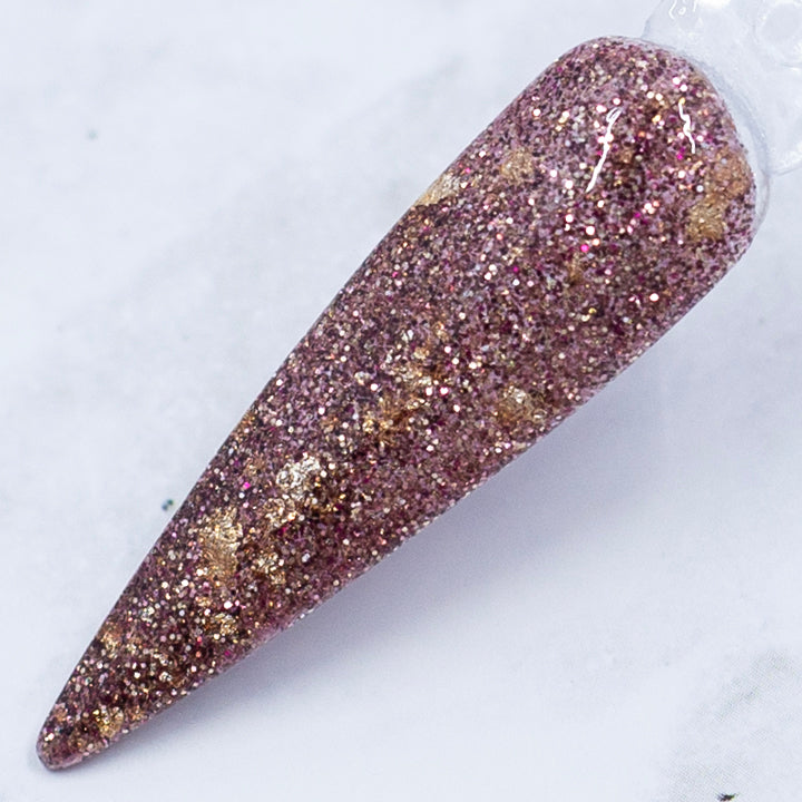 Rosé AF is a fine glitter nail dip powder bursting with a rich blend of gold and rose gold sparkle, infused with hints of deep pink and decadent chocolate brown — finished with warm gold foils for that extra bit of luxury.